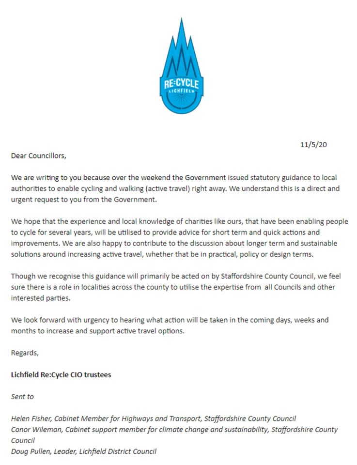 A week or so after we wrote to Staffordshire County Council asking how they would immediately enable active travel (see our letter at the bottom of the page), they have announced a 10 year infrastructure plan for cycling and walking which you can read here. This 10 year plan does not address the directive from the Government to urgently tackle social distancing guidance and public transport restrictions due to the Coronavirus pandemic.