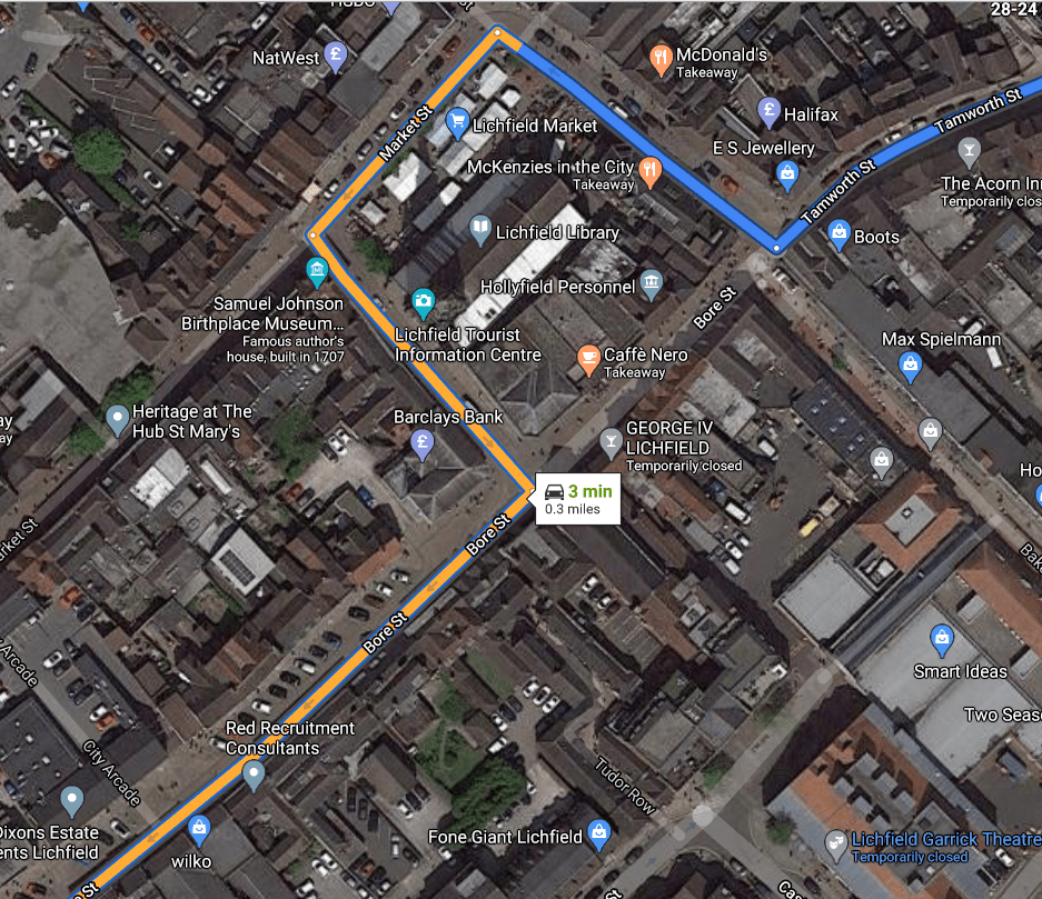 The area marked on the map above is the one-way route through the centre of the City and is also where many people would want to park their bikes. On Tamworth Street, Conduit Street, Market Street, Breadmarket Street, and Bore Street there could be imaginative use of spaces that could be home to multiple clusters of on street cycle stands accommodating 10 or 12 bikes per space, protected with planters or street furniture.