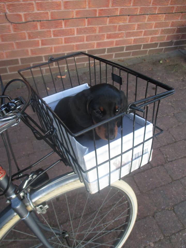 Here is Pedro in the basket we are loaning for the next three weeks, until he has finished his course of vaccinations, to get out and about.