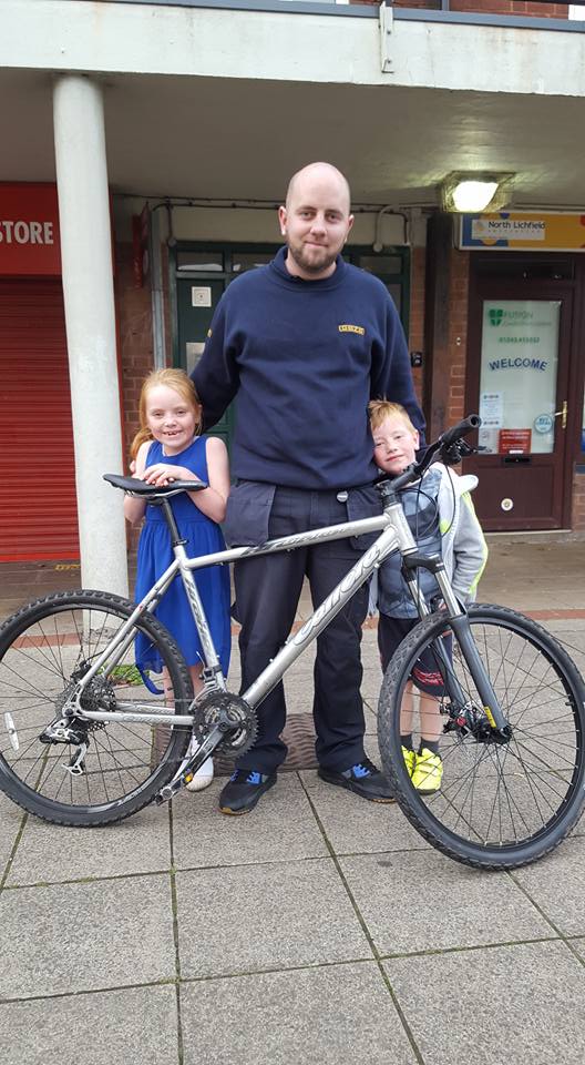 Local musician Adam is using the mountain bike we gave him to help him look for work, for cycling with his family and for getting around to gigs he does. The last bike he had was stolen and he hasn’t been able to replace it until now. At the handover Adam said that he was “completely blown away, by what the Lichfield Re-Cycle project are doing, and what a great use for bicycles that are no longer needed……awesome”.